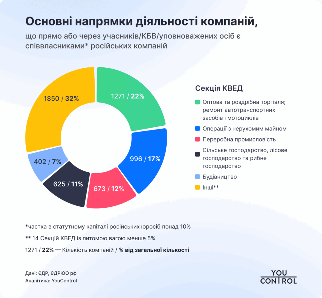 Фахівці YouControl вивчили дані з Єдиного державного реєстру юридичних осіб, фізичних осіб-підприємців та громадських формувань (далі — ЄДР) та Єдиного державного реєстру юридичних осіб російської федерації (далі — ЄДРЮО рф) і виявили наявність певних зв’язків понад 6 500 українських суб’єктів господарювання за рахунок участі в статутних капіталах із 12 тисячами юросіб, зареєстрованих відповідно до російського законодавства. Зазначимо, що як одна українська компанія чи ФОП можуть мати ймовірний зв’язок із кількома російськими юридичними особами одночасно, так і одна російська юрособа може мати зв’язок із кількома українськими компаніями.