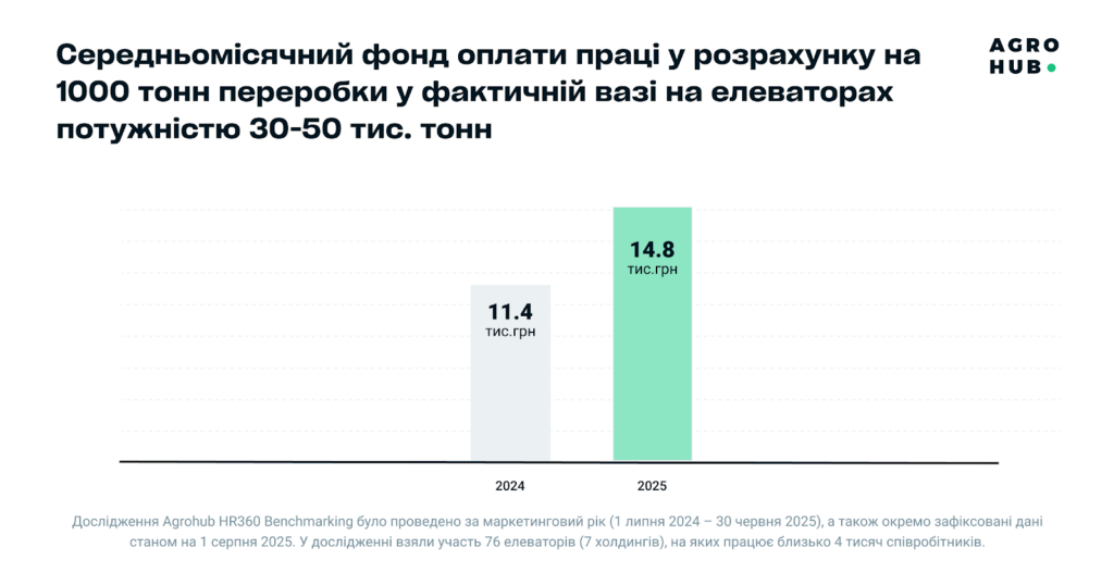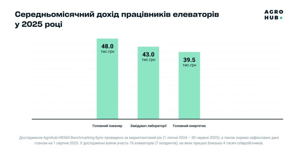 Дослідження доходів і функціоналу персоналу елеваторів Agrohub HR360 Benchmarking було проведено за маркетинговий рік (1 липня 2024 – 30 червня 2025), а також окремо зафіксовані дані станом на 1 серпня 2025. У дослідженні взяли участь 76 елеваторів (7 холдингів), на яких працює близько 4 тисяч співробітників.