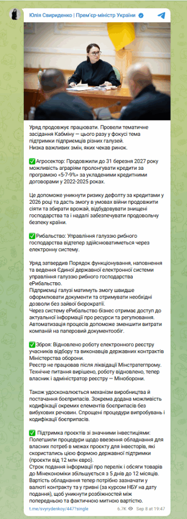 Кабінет Міністрів провів тематичне засідання, присвячене підтримці підприємців у різних галузях. Премʼєр-міністр Юлія Свириденко підкреслила, що уряд продовжує працювати над важливими змінами, яких очікує ринок, повідомляє «Комерсант Український»