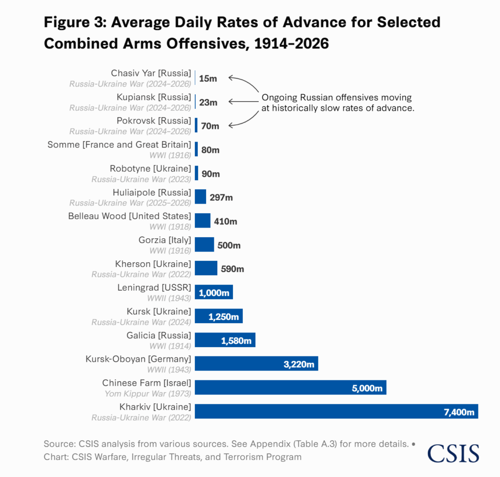 Попри значні втрати, дослідження фіксує вкрай повільне просування російських військ. У середньому темп наступу окупаційних сил становить від 15 до 70 метрів на добу.