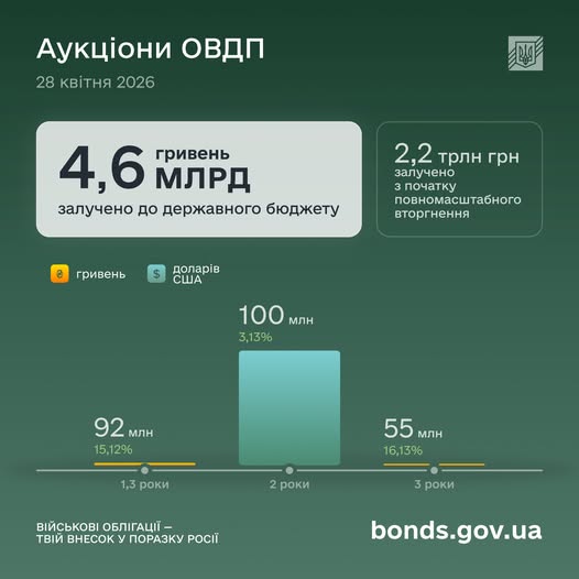 Міністерство фінансів України залучило до державного бюджету майже 4,6 млрд грн в еквіваленті за результатами аукціону з розміщення облігацій внутрішньої державної позики. На торги 28 квітня виставили ОВДП у гривні та доларах США. Про це повідомило Міністерство фінансів України, інформує «Комерсант Український»