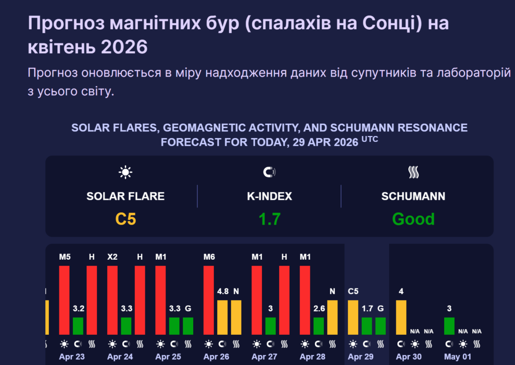 За даними сервісу Meteoagent, у середу, 29 квітня, на Землі очікується магнітна буря жовтого рівня. Протягом попередньої доби сонячна активність була помірною, однак геомагнітне поле може перейти в збурений стан.