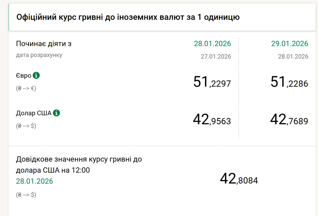 Водночас курс євро залишається стабільним. За даними НБУ, офіційний курс гривні до євро на 29 січня становить 51,22 гривні, що повністю відповідає показнику попереднього дня.