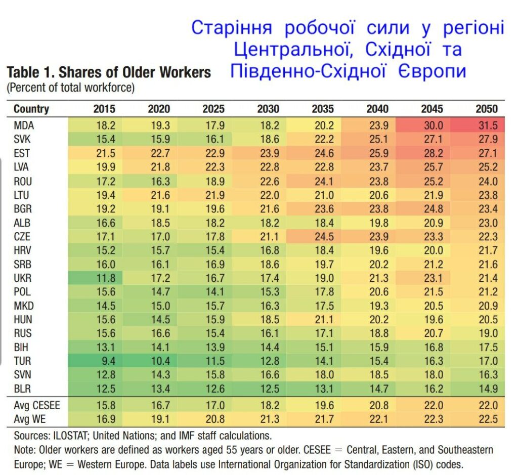 Ще у 2019 році експерти Міжнародний валютний фонд (МВФ) у звіті Demographic Headwinds in Central and Eastern Europe оцінили, як старіння населення впливатиме на економіки 20 країн Центральної, Східної та Південно-Східної Європи до 2050 року. Серед них — Україна.