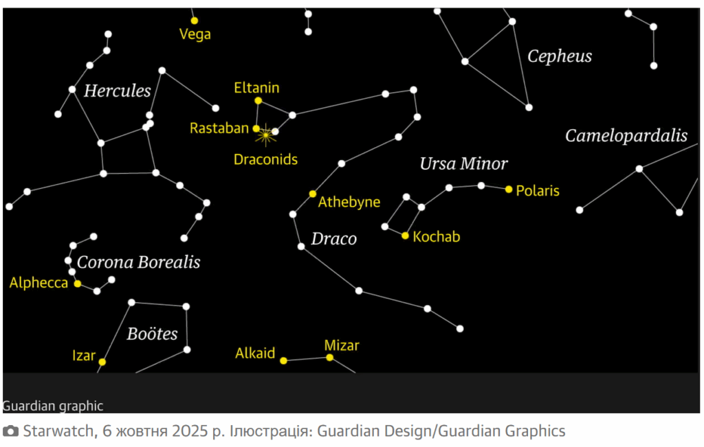 8–9 жовтня 2025 року — гарна нагода поглянути в небо й спробувати побачити Драконіди. Хоча умови можуть бути не ідеальними через місяць, навіть кілька яскравих метеорів зроблять вечір особливим. Підійдіть із терпінням, оберіть темне місце, дайте очам адаптуватися і тримайте погляд на північному небі — можливо, вам пощастить побачити «вогні дракона».