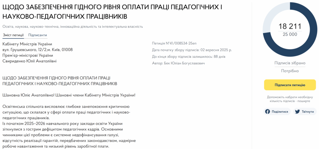 “The Law of Ukraine “On Education” of September 5, 2017 (Article 61) establishes guarantees for the level of salaries of pedagogical and scientific-pedagogical workers. However, eight years after the adoption of the Law, the relevant provisions remain unimplemented. Moreover, the level of remuneration in the field of education lags far behind the average salary in other sectors of the economy, which, according to official data, exceeds it by almost 50%,” the petition says.