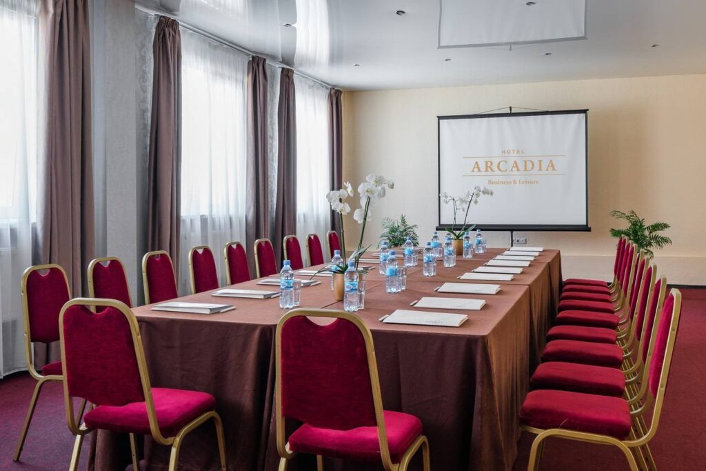 - Hotel Arcadia is a large three-star complex with an area of 10,774 m². It has 287 rooms, a banquet hall and five conference halls, making it attractive for events and tourist vacations.