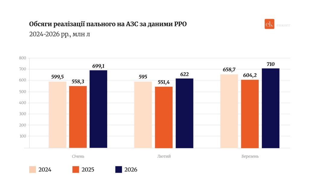 March 2026 turned out to be a record month for the Ukrainian fuel market. Over the course of the month, gas stations sold 710 million liters of fuel. This is the highest March figure since at least 2024.