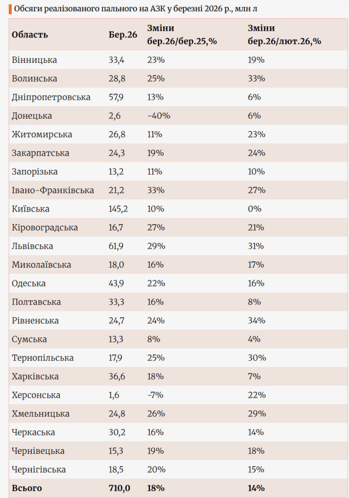 Despite the most dynamic growth in the west, the Kyiv region remains the absolute leader in total sales volume. In March, 145.2 million liters of fuel were sold there.