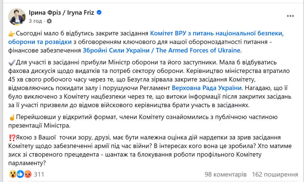 “The Minister of Defense and his deputies arrived to participate in the meeting. There was supposed to be a professional discussion on the expenditures and needs of the defense sector. The leadership of the Ministry lost 45 minutes of their working time because Bezuhla disrupted the closed meeting of the Committee, refusing to leave the room and violating the Rules of Procedure of the Verkhovna Rada of Ukraine,” said Friz