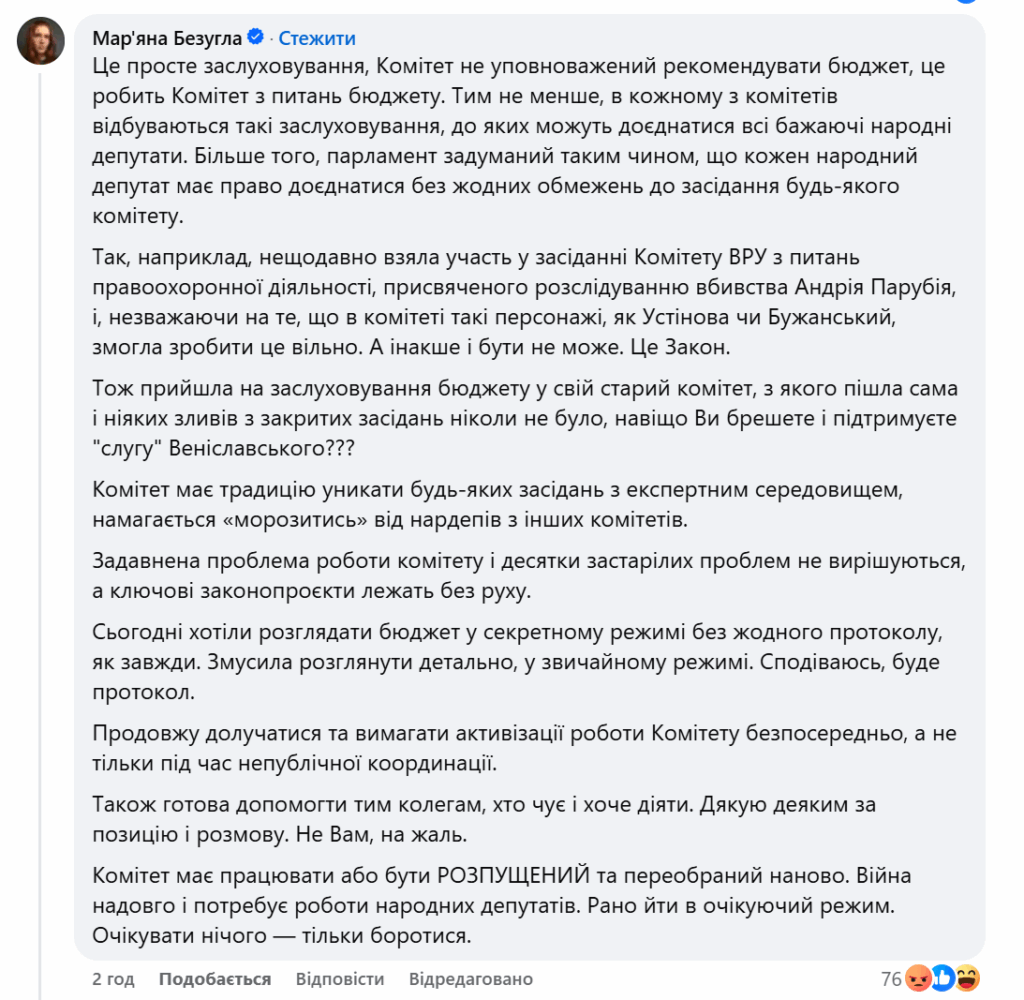 In her comments under the post, Bezuhla criticized the work of the parliamentary committee, emphasizing the lack of transparency in the processes and the delay in the consideration of important draft laws.