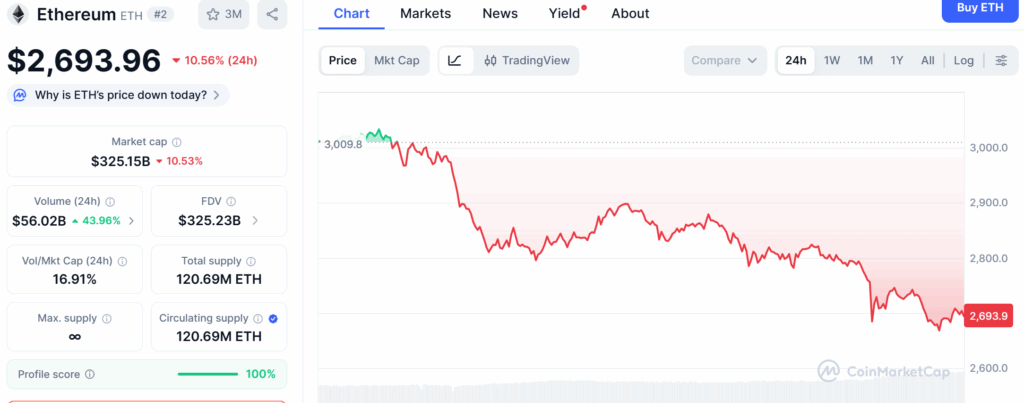 Ethereum also fell by more than 2%, hitting a four-month low of $2,693.96.