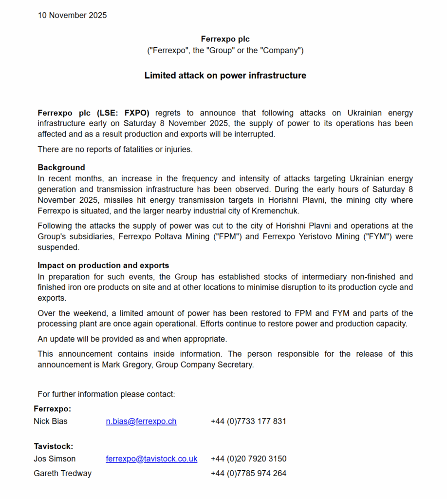 The Swiss mining company Ferrexpo plc (LSE: FXPO) reported that following the Russian missile attacks on Ukraine’s energy infrastructure on the morning of November 8, 2025, electricity supply to its enterprises was disrupted. As a result, production and exports have been temporarily suspended. This is stated in a statement published by the company on the website of the London Stock Exchange, "Komersant Ukrainian" reports