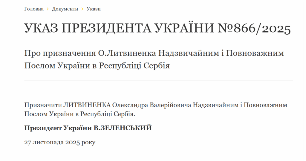 By Decree No. 866/2025, Oleksandr Lytvynenko was appointed Ambassador of Ukraine to Serbia.