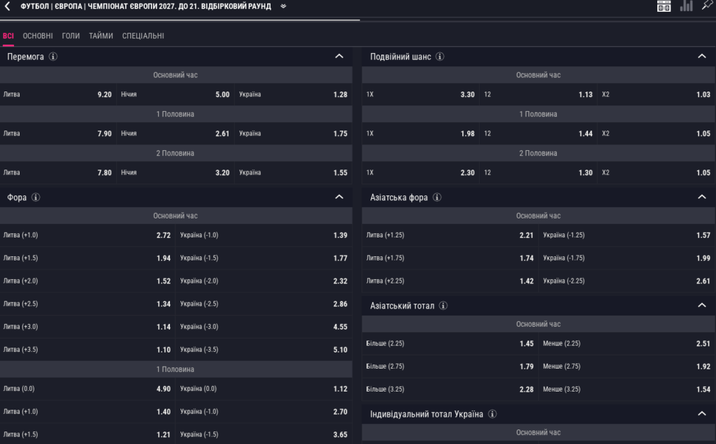 The Ukrainian national team is the absolute favorite of this match. The bookmakers’ odds on its victory are 1.28, while Lithuania’s victory is given at 9.20.