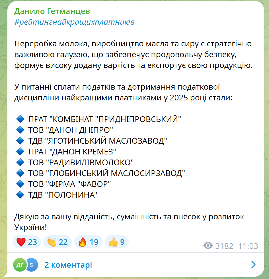 Ukraine has identified the best taxpayers among dairy companies based on the results of 2025. The rating includes leading producers of milk, butter, and cheese, which demonstrate high tax discipline and make a significant contribution to the state budget. This was announced by the head of the Verkhovna Rada Committee on Finance, Tax, and Customs Policy, Danylo Getmantsev, according to "Komersant Ukrainian".