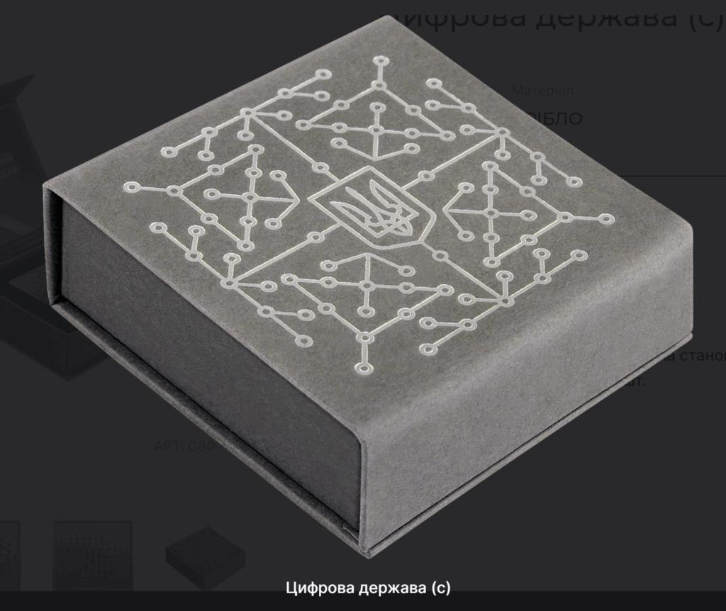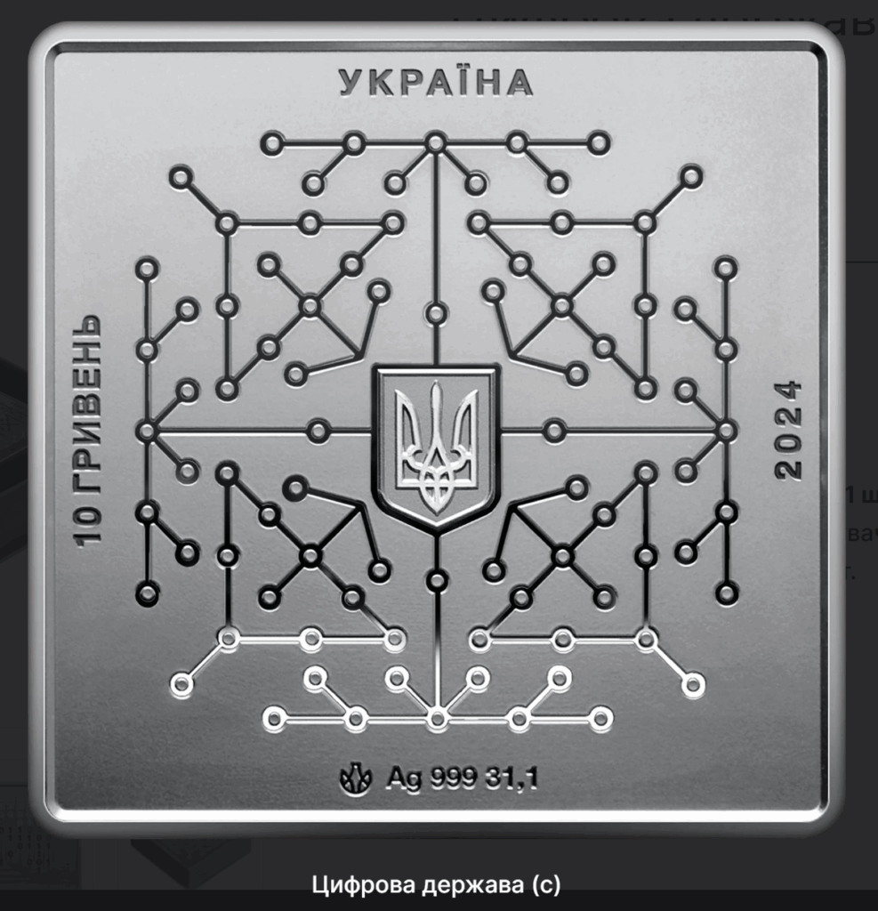 On the obverse of the coin, in the center of the composition, there is a small State Emblem of Ukraine surrounded by an electronic circuit/network. This combination symbolizes Ukraine as a single digital system, a monolithic and integral state that has united all aspects of its citizens’ lives with the help of the latest technologies.