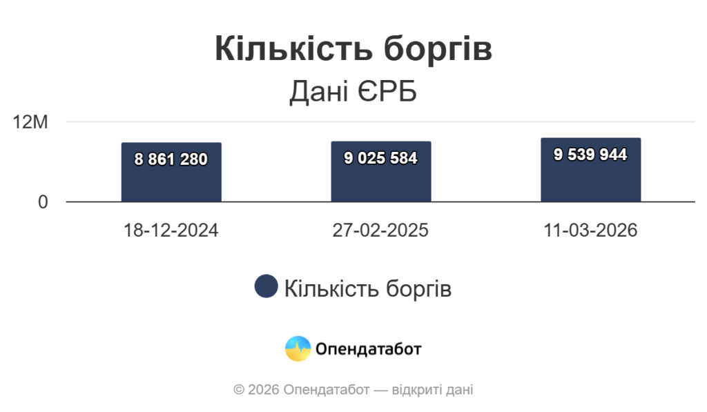 As of early March 2026, there were over 9.5 million debts recorded in Ukraine’s Unified Register of Debtors. Over the course of the year, the number of debts increased by more than half a million. This is according to data from the OpenDataBot analytical platform, as reported by "Komersant Ukrainian"