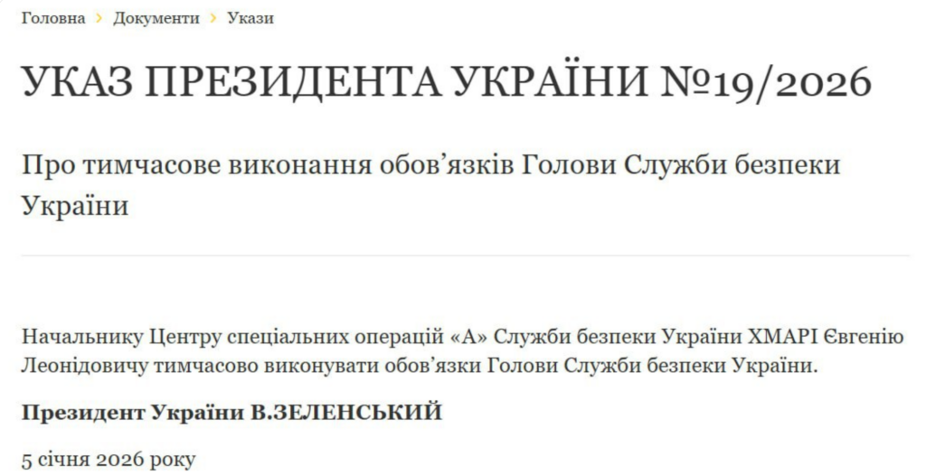 “Head of the Special Operations Center “A” of the Security Service of Ukraine, Khmara Yevhen Leonidovych, is to temporarily act as the Head of the Security Service of Ukraine,” the document says.