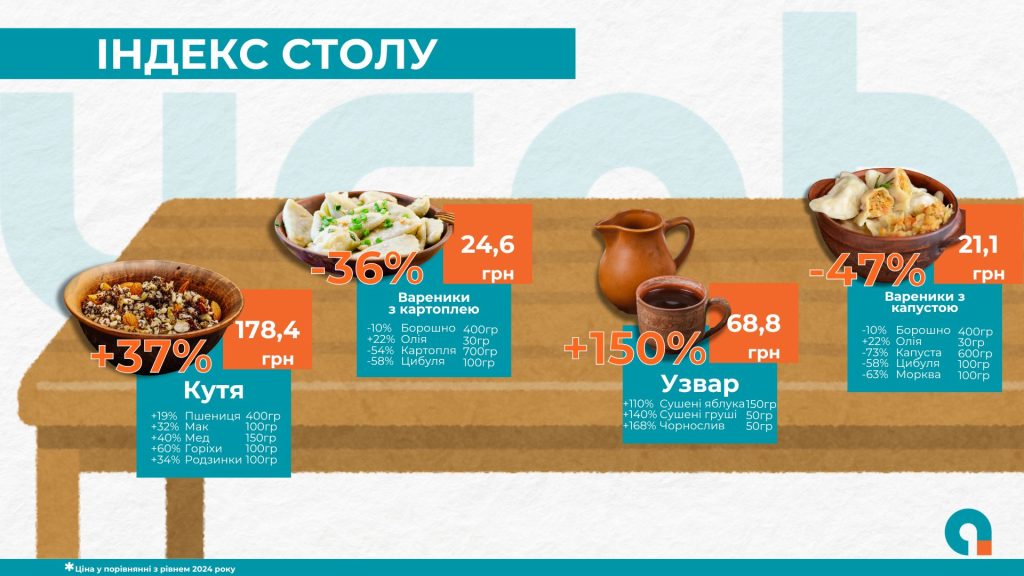 However, despite the cheap vegetables, the main symbols of the Christmas table – kutia and uzvar – have significantly increased in price. The kutia index increased by 37%. This is due to the rise in price of all its components: nuts went up by 60%, honey by 40%, and poppy seeds and raisins added more than 30%. The leaders in terms of price growth were the ingredients for jam: prunes went up by 168%, dried pears by 140%, and apples by 110%, which led to a 150% increase in the price of the drink.