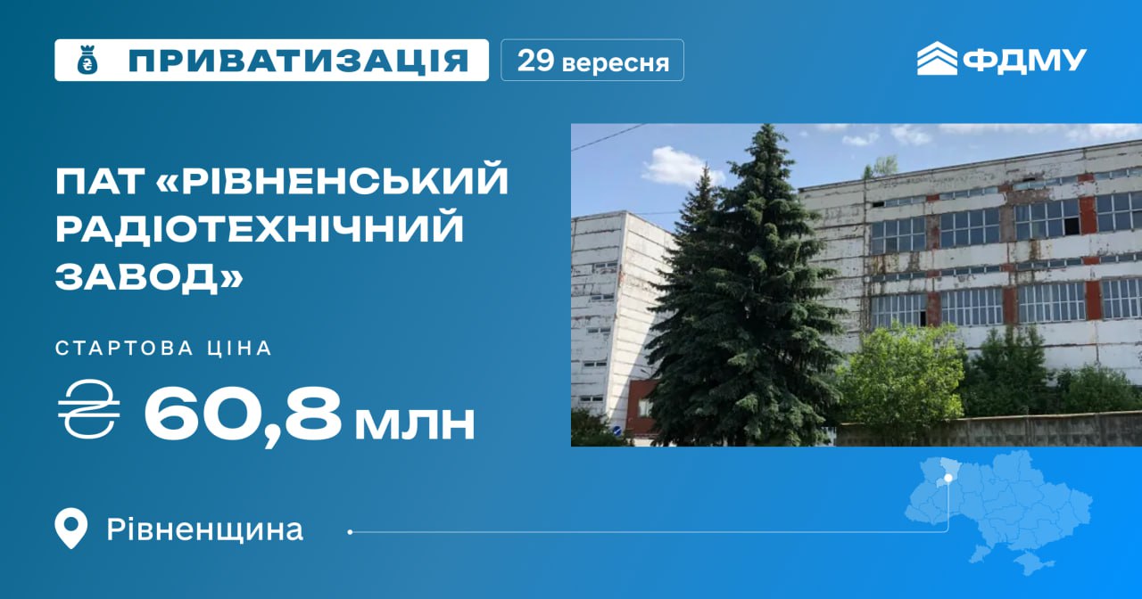 TheState Property Fund of Ukraine (SPFU ) has announced a privatization auction of a 50% stake in 1 share of Rivne Radio Engineering Plant, "Komersant Ukrainian…