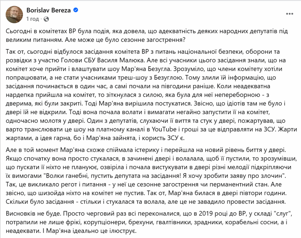 “When the inadequate MP came to the committee, she faced a force that was irresistible to her – the doors were closed. Then Mariana decided to knock. Of course, there were no idiots there and the door was not opened. Then she started screaming and demanding to be immediately admitted to the committee, while pounding on the door,” Bereza ironically wrote in his post.