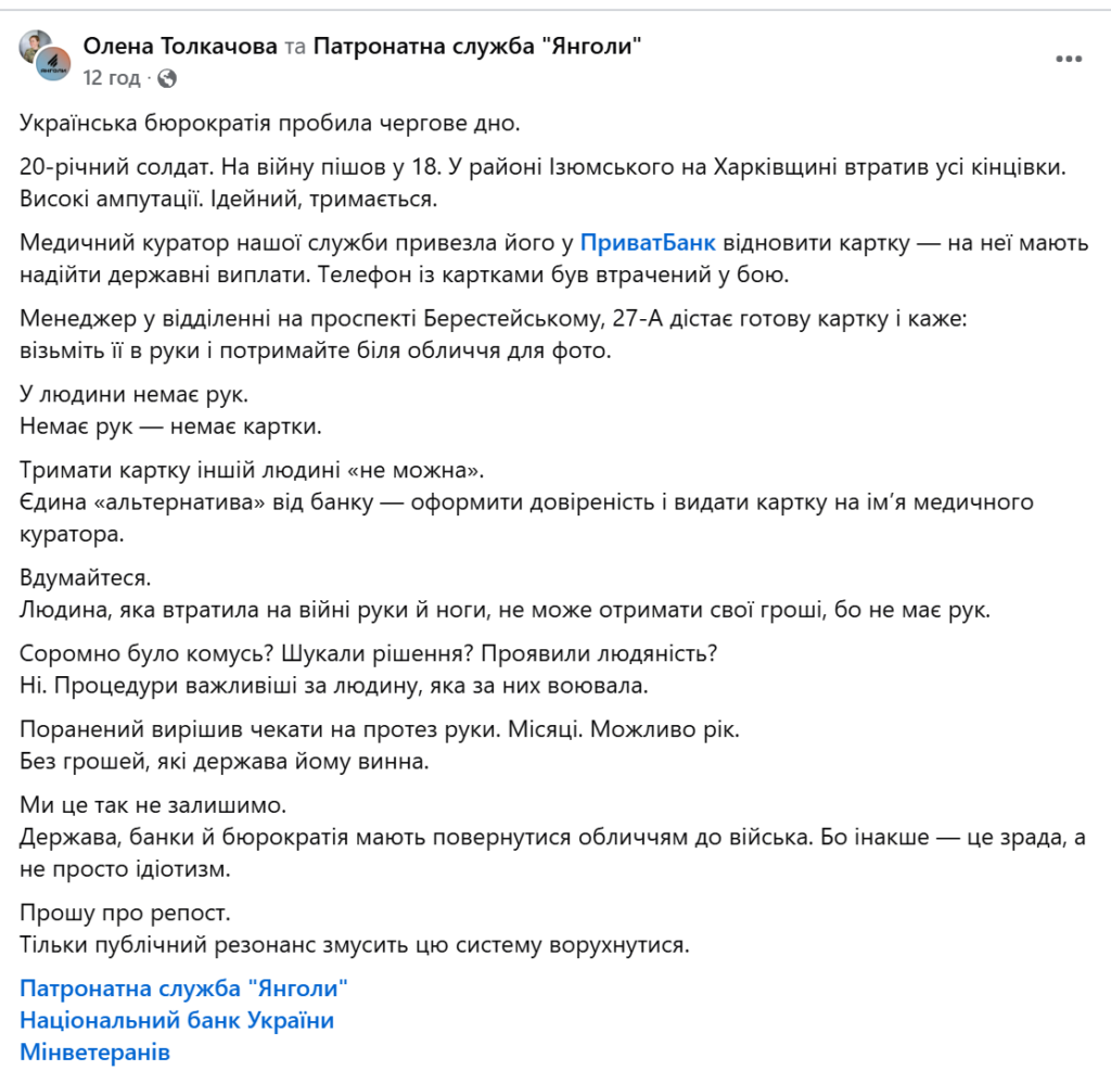 Scandal in Kyiv: PrivatBank started an audit after refusing to pay a veteran without arms and legs