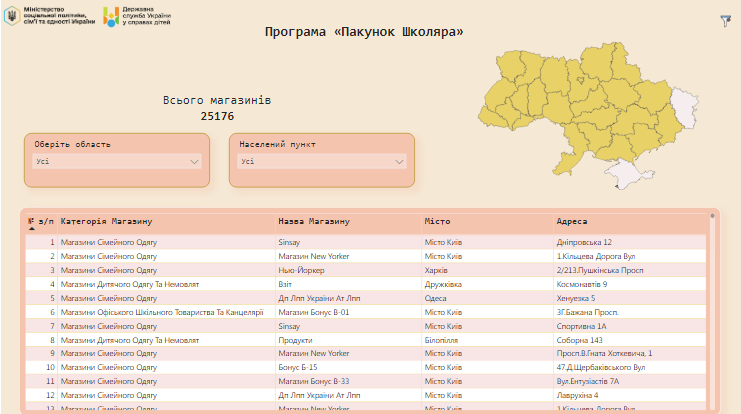 The dashboard displays more than 25 thousand retail outlets across Ukraine, where it is guaranteed that you can pay with the program’s funds. You can filter by region and territorial community to find the nearest stores.