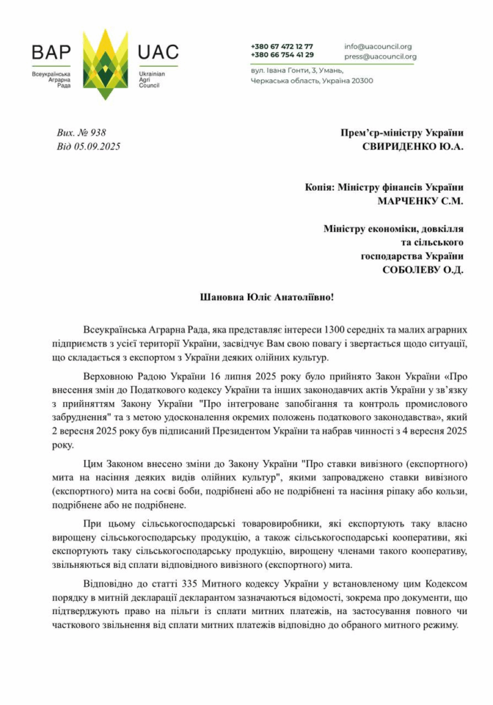 The All-Ukrainian Agrarian Council (AAC) has already appealed to Prime Minister Yulia Svyrydenko to urgently develop a regulation that will correct the gaps, as the situation of stopping exports could deal a significant blow to the agricultural sector.