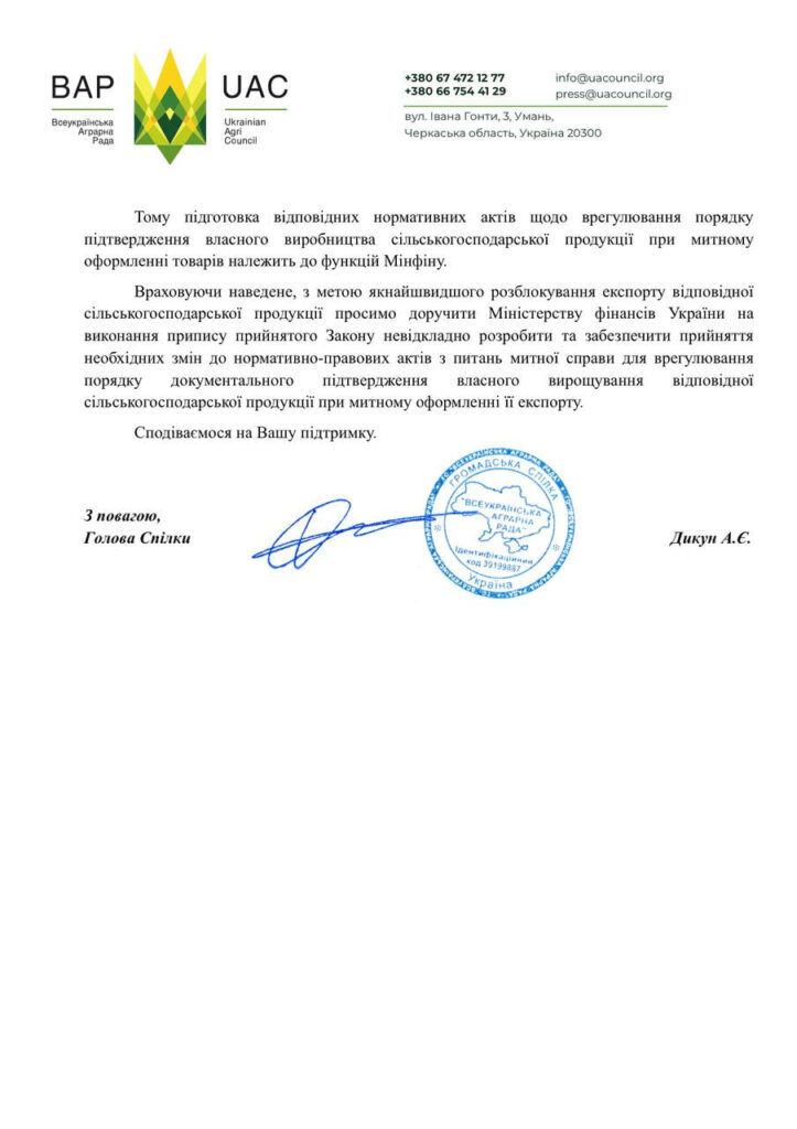 Taking into account the above, in order to unblock the export of relevant agricultural products as soon as possible, we ask the Ministry of Finance of Ukraine to immediately develop and ensure the adoption of the necessary amendments to the regulatory legal acts on customs issues to regulate the procedure for documenting the own cultivation of relevant agricultural products during customs clearance of its export, – says the letter of the UAC to the head of the Government signed by the head of the organization Andrii Dy