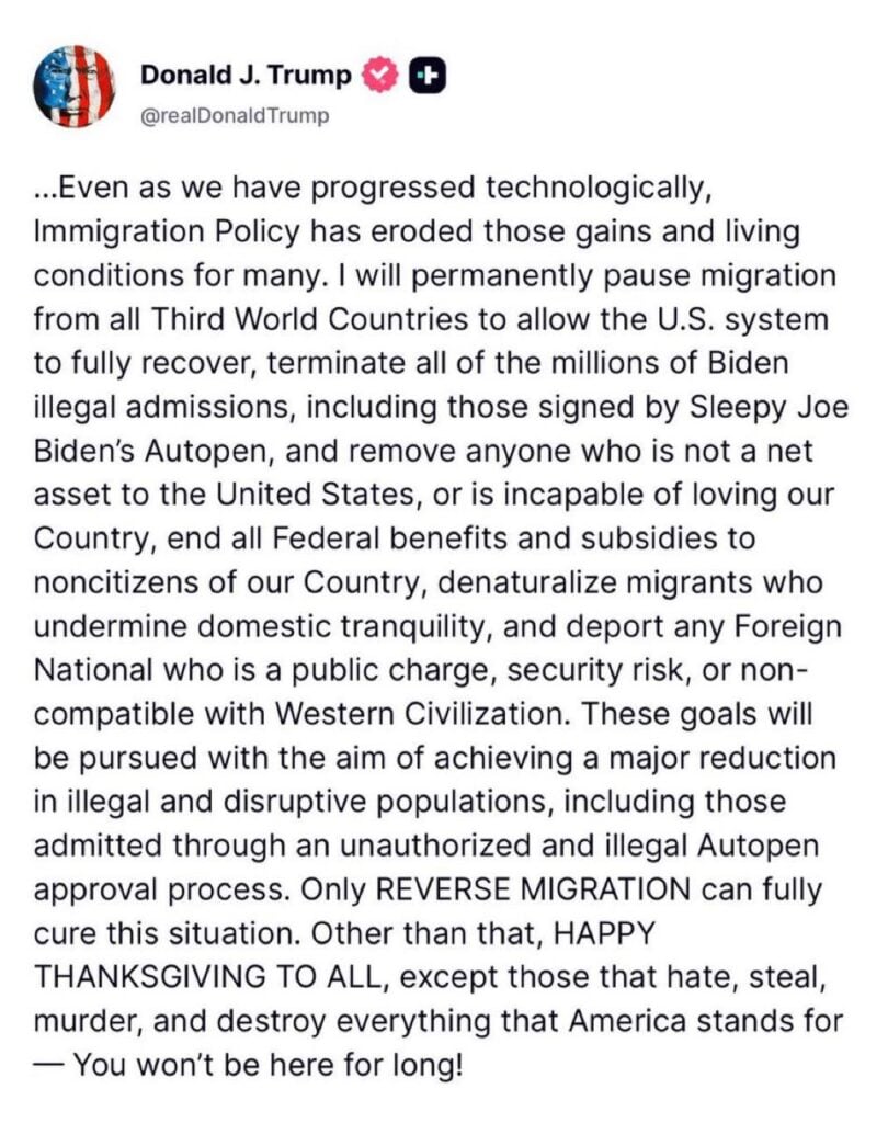 “I will permanently suspend migration from all third world countries…I will revoke all of Biden’s millions of illegal admissions and deport anyone who is not a net asset to the United States or is incapable of loving our country. Only reverse migration can fully remedy the situation,” Trump wrote.