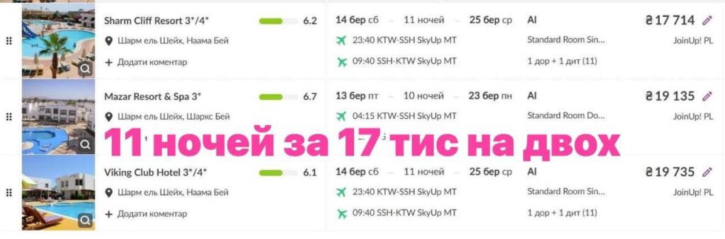 At mid-range hotels, prices for a week-long vacation in sheltered bays start at 20,000–45,000 UAH for two people. There are now more frequent offers where a couple can vacation for as little as 18,000 UAH, including airfare.