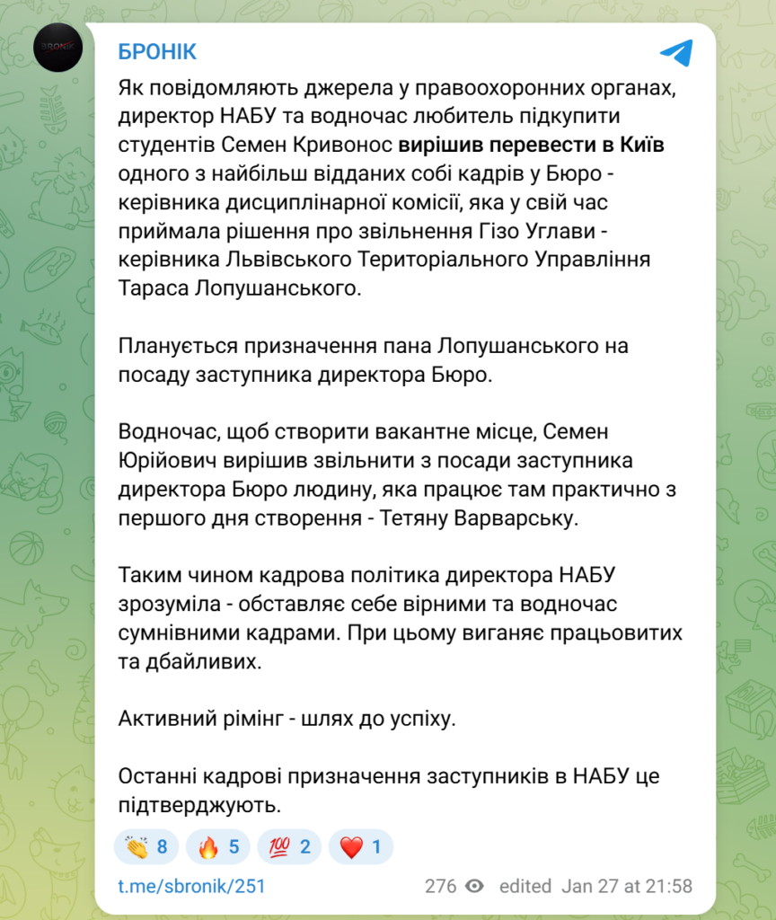 “…Semen Kryvonos decided to transfer one of the most loyal members of the Bureau to Kyiv – the head of the disciplinary commission, which at one time made the decision to dismiss Gizo Uglava – the head of the Lviv Territorial Administration, Taras Lopushansky,” he wrote.