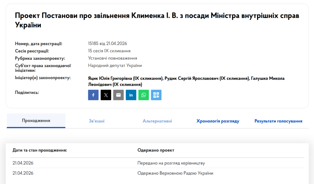 The Verkhovna Rada’s website states that the document is titled “Draft Resolution on the Dismissal of I. V. Klymenko from the Post of Minister of Internal Affairs of Ukraine.”