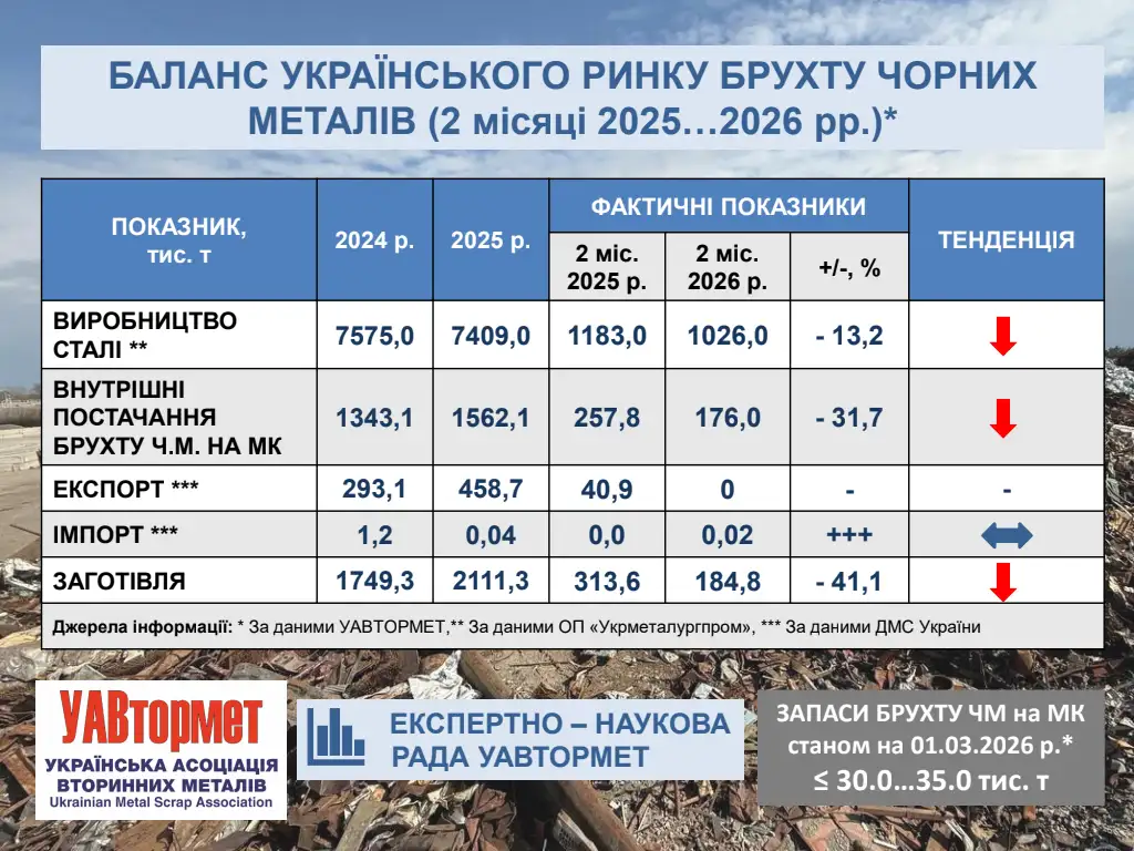 In January–February 2026, compared to the same period in 2025, purchases of ferrous metal scrap by metallurgical enterprises fell by 31.7%—from 257,800 tons to 176,000 tons. At the same time, procurement fell by a record 41.1%: from 313,600 tons to 184,800 tons. This is evidenced by data from the Ukrainian Association of Secondary Metals (UAVtormet), reports "Komersant Ukrainian".