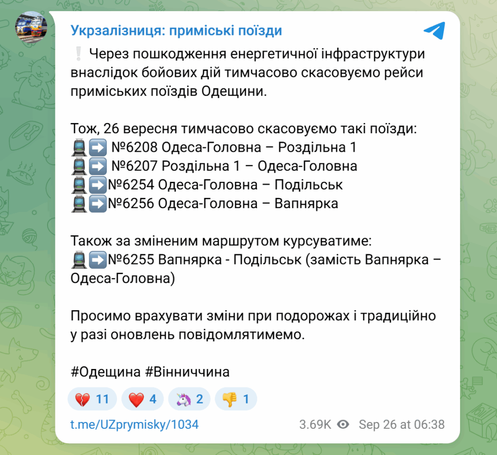 Amid damage to energy infrastructure as a result of another Russian attack, Ukrzaliznytsia has announced temporary changes in the movement of suburban trains in Odesa region. This is reported by "Komersant Ukrainian" with reference to a post by Ukrzaliznytsia on Telegram.