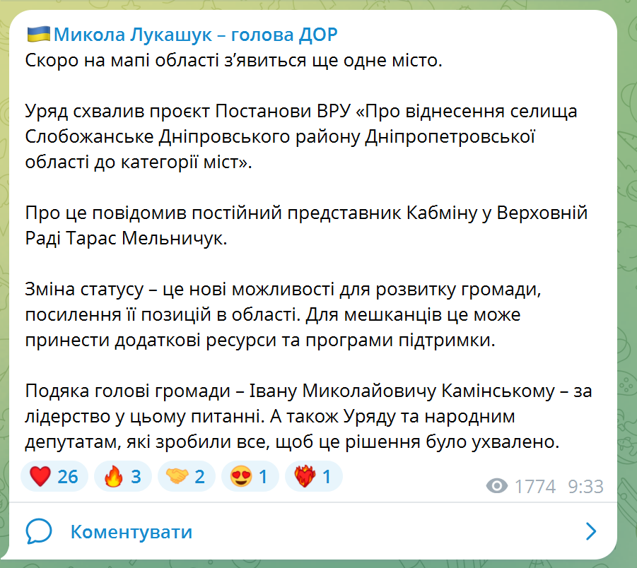 “The draft resolution of the Verkhovna Rada of Ukraine “On classifying Slobozhanske village, Dnipro district, Dnipro region, as a city” has been approved. The draft proposes to classify the village of Slobozhanske, Dnipro district, Dnipro region, as a city,” the report says.