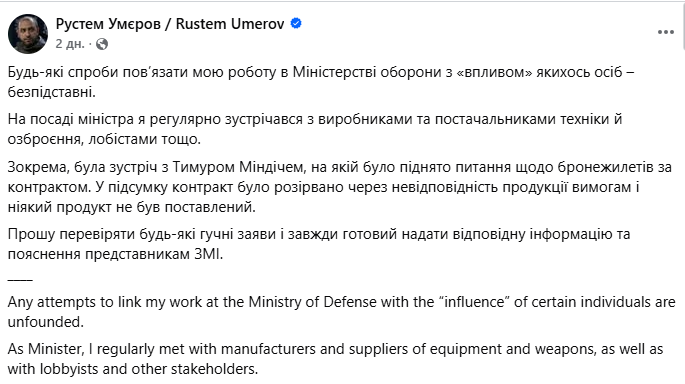 Mindych is also linked to attempts to supply bulletproof vests to the Armed Forces. National Security and Defense Council Secretary Rustem Umerov, who headed the Defense Ministry until 2025, confirmed that he had met with Mindych about the bulletproof vest contract. In the end, according to Umerov, the contract was terminated because the products did not meet the requirements, and no batch was ever delivered.