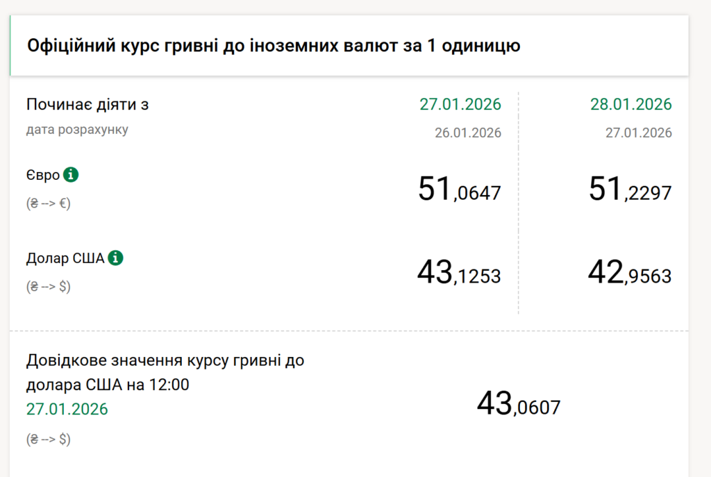 As of January 28, the National Bank set the dollar exchange rate at UAH 42.95, while a day earlier it was UAH 43.12.