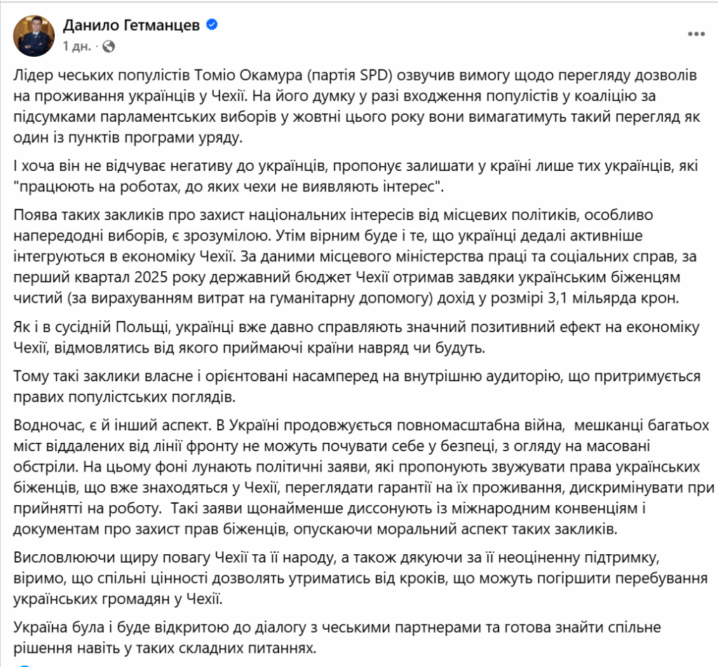 The leader of the tax committee of the Verkhovna Rada, Daniil Hetmantsev, has reacted to the statements of Czech politician Tomio Okamura. Daniil Hetmantsev noted that such political appeals on the eve of the elections have an internal political background and do not take into account the real contribution of Ukrainians to the Czech economy.