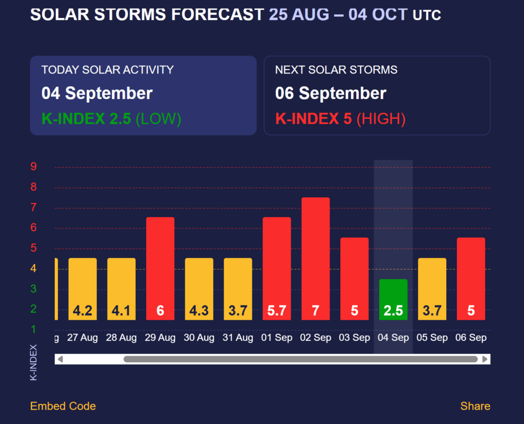 Geomagnetic storms are classified according to their power level – the K-index – from 2 to 9. The higher the K-index, the stronger the storm and its consequences and impact on people and equipment.