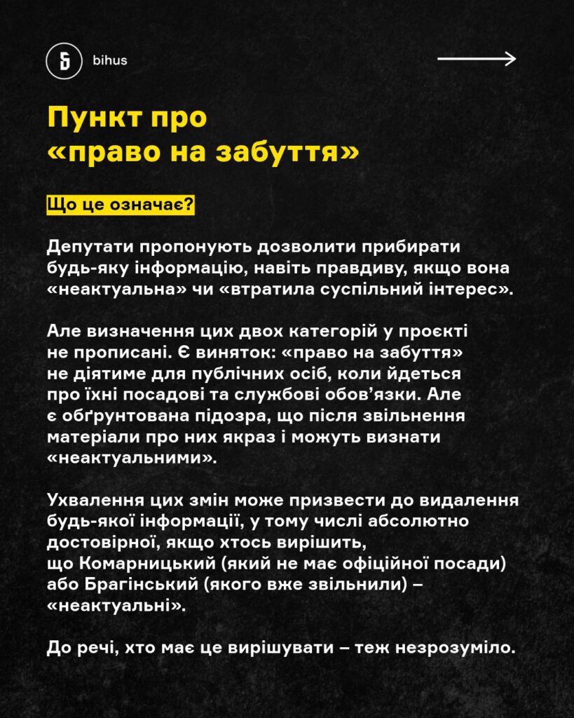 “The adoption of these changes could lead to the removal of any information, including absolutely reliable information, if someone decides that Komarnytskyi (who has no official position) or Braginskyi (who has already been fired) are “irrelevant,” Bihus.Info reports.