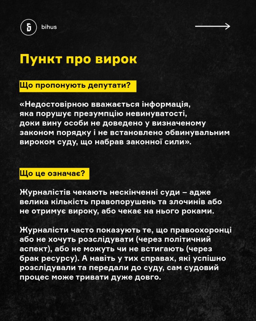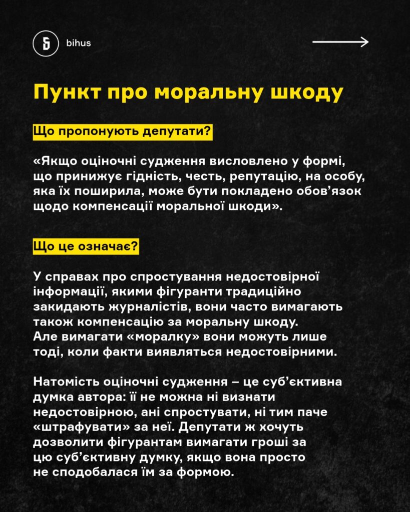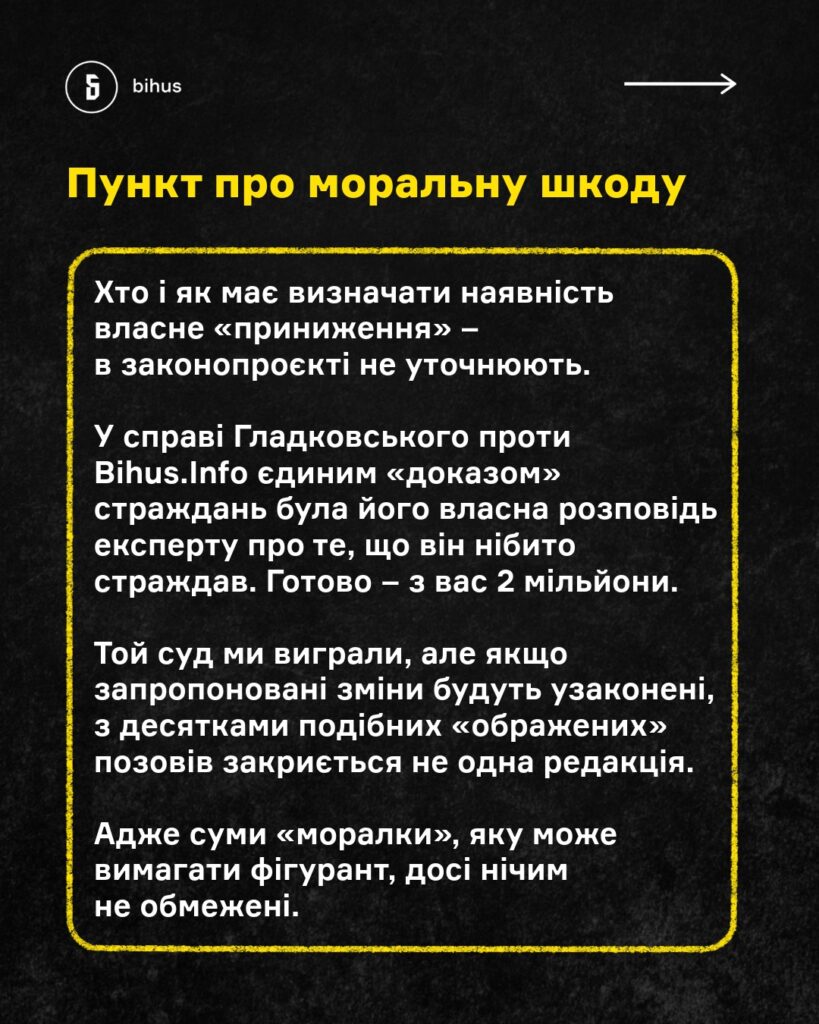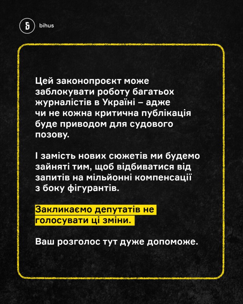 “It is even proposed to allow claiming compensation for criticism if the person involved did not like the tone of the publication,” Bihus.Info says.