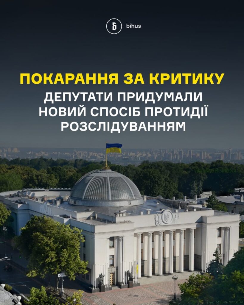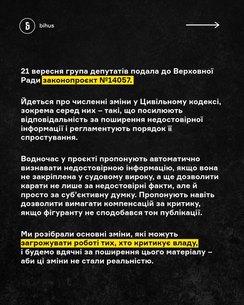on September 21, a group of MPs registered in the Verkhovna Rada draft law No. 14057, which provides for amendments to the Civil Code of Ukraine. The Bihus.Info investigative journalism project reported that this bill increases legal liability for critical publications and may jeopardize the very existence of investigative journalism, "Komersant Ukrainian" reports