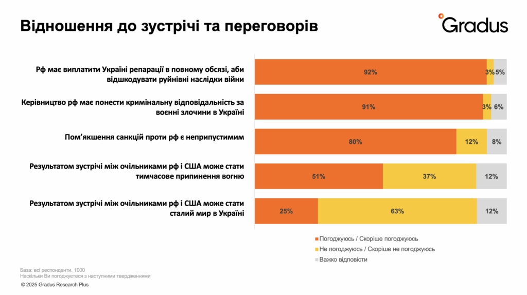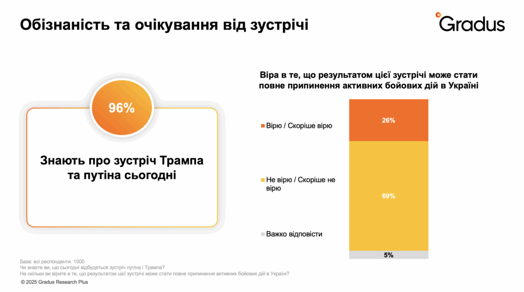 We see high engagement of Ukrainians in the topic and almost complete awareness of the meeting. At the same time, rational skepticism prevails: public opinion is divided between cautious optimism about possible tactical outcomes (such as a temporary truce) and the belief that a strategic end to the war remains unlikely in the short term,” said Yevheniia Blyzniuk, founder and director of Gradus Research.