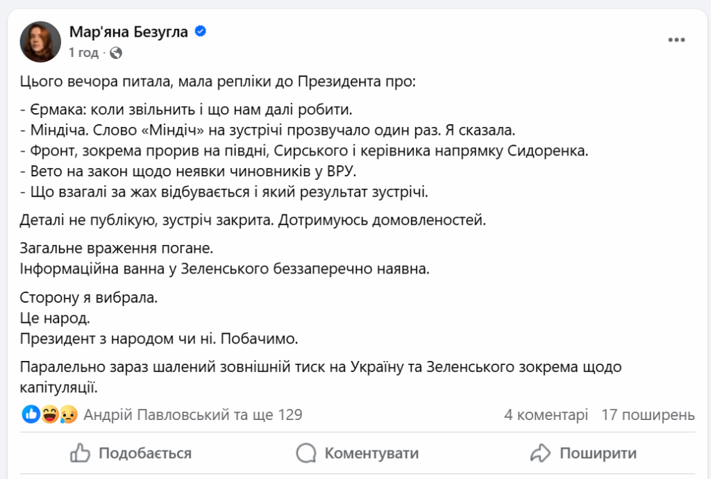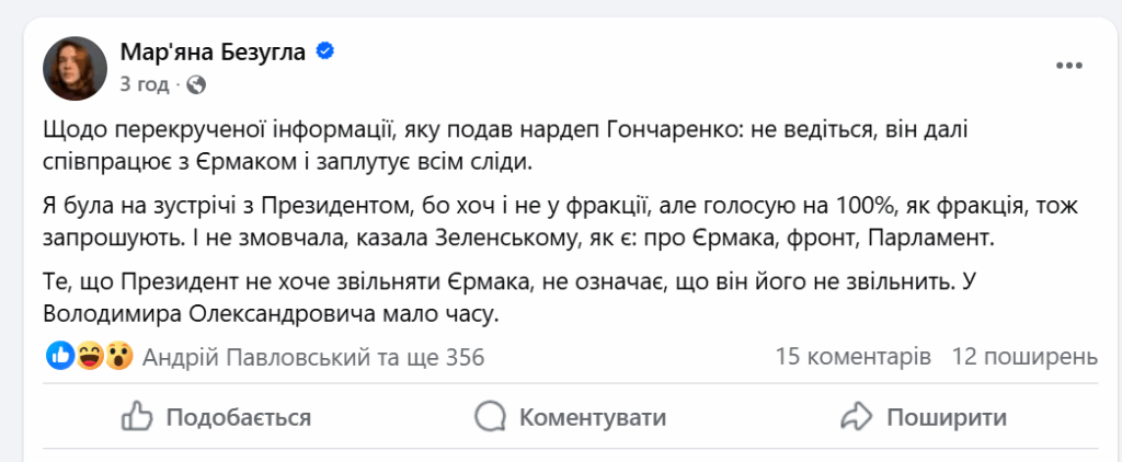 MP Mariana Bezuhla published a series of comments in which she described the details of the closed meeting of MPs with President Volodymyr Zelenskyy. According to her, the meeting left a “bad impression,” and the key issues she raised concerned the work of the head of the Presidential Office, Andriy Yermak, the situation at the front, and decisions on parliamentary discipline.