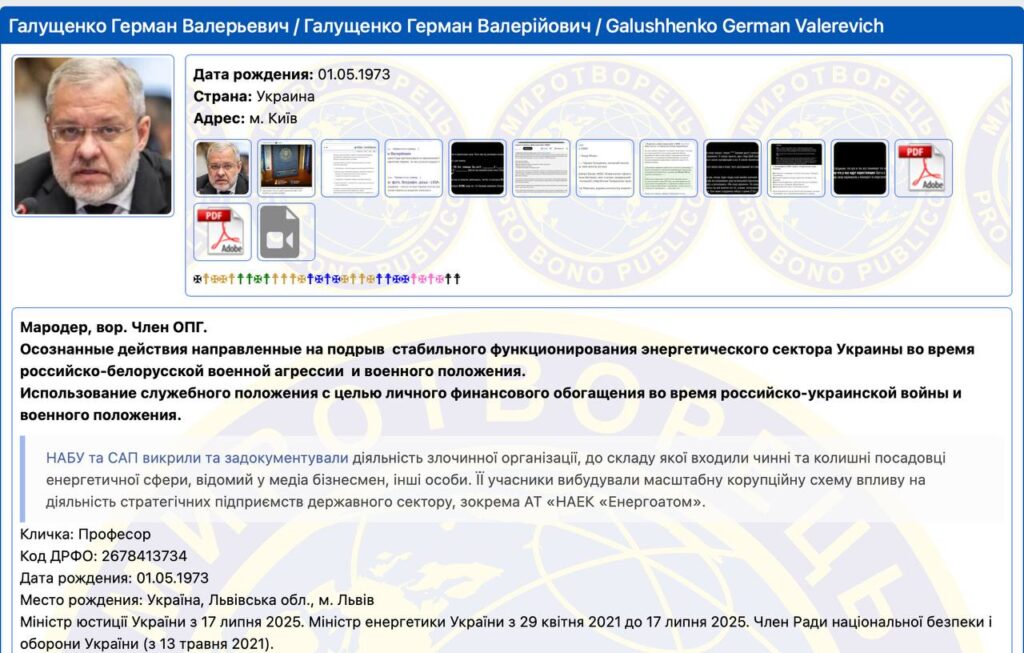 Зауважимо, що 10 листопада Галущенка внесли до бази даних сайту “Миротворець”. На сторінці зазначено, що він нібито — “мародер, крадій і член організованого злочинного угруповання”. У публікації йдеться про “свідомі дії”, які, за версією авторів порталу, спрямовані на підрив стабільної роботи енергетичного сектору України під час війни та воєнного стану.