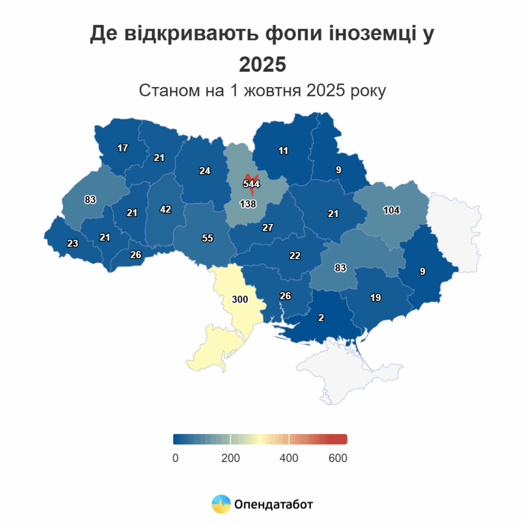 Найменше іноземних підприємців працює у Волинській, Чернігівській, Сумській, Донецькій і Херсонській областях — від 2 до 17 ФОПів.