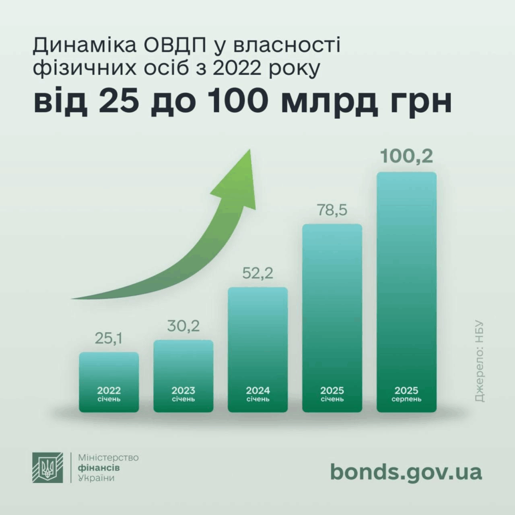 Національний фінансовий регулятор — НБУ — також підтверджує: в Україні стрімко зростає обсяг облігацій внутрішньої державної позики (ОВДП), якими володіють фізичні особи. За період із січня 2022 року до серпня 2025 року цей показник збільшився з 25,1 млрд грн до 100,2 млрд грн, тобто більш ніж у чотири рази.