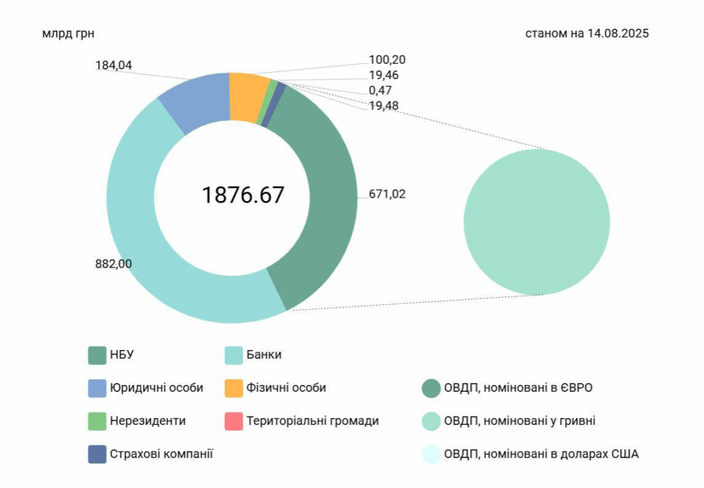Станом на 14 серпня 2025 року загальний обсяг облігацій внутрішньої державної позики (ОВДП) в обігу в Україні становить 1,876 трлн грн, свідчать дані Міністерства фінансів та НБУ.